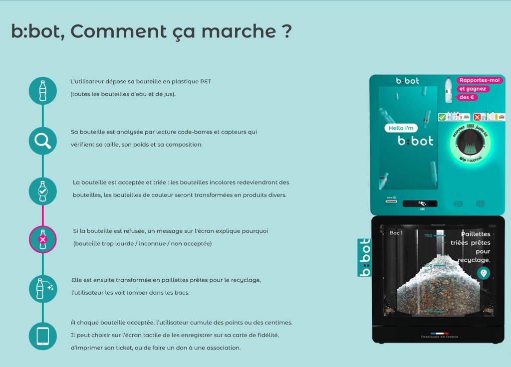 b:bot est une machine de collecte de bouteilles plastique innovante et « made in France » qui réinvente totalement la consigne pour la rendre adaptable, communautaire et solidaire.